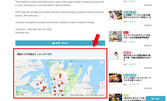 ご自身の投稿が地図に反映されていない場合は、掲載物件の詳細住所をご記入ください。物件の住所にある「ストリート番号」、「ストリート名」、「サバーブ」、「州」、「ポストコード」が合っていないと、地図上で正しく表示されませんのでご確認ください。