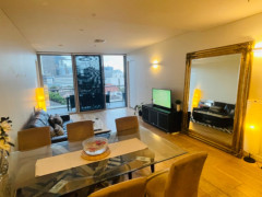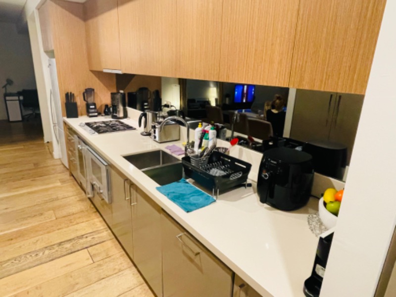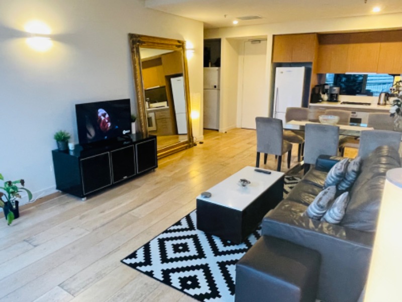 70" smart TV and large dining table with 6 chairs in the living room. The apartment comprises all new modern fittings throughout. Super chill environment and very quiet.