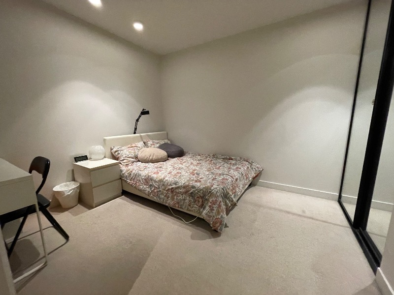 The room is furnished with a double bed and a desk set, and the apartment offers a clean, comfortable living space.