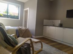 The space features a cozy sleeping area, furnished living space, and a functional kitchen with essential appliances. Just bring your suitcase and settle in!