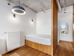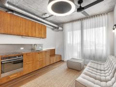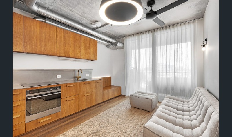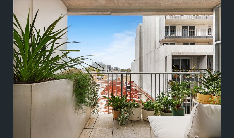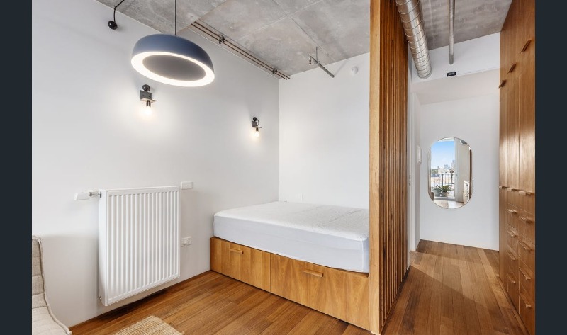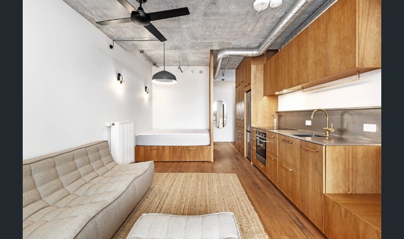 This apartment comprises timber floorboards, with wooden, concrete & tiled finishes, hydronic heating & double-glazed windows, ample pantry & underbed storage, designed with functional minimalism, artistry, community & environment in mind.