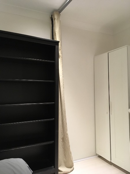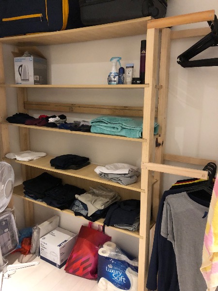 ・お部屋は鍵付きで、ダブルベッドとワードローブが備わっています。