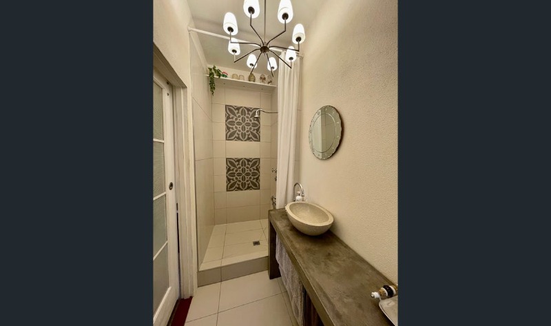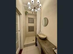 - Chic renovated bathroom with concrete vanity and luxurious shower.