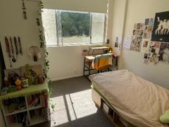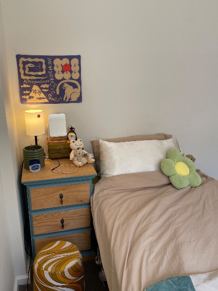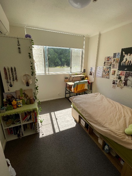 お部屋にはシングルベッド、寝具、デスク、エアコンが完備されています。鏡付きの棚の一部も、もし必要でしたらお使いいただいて結構です(写真3枚目)。部屋の写真にある壁の装飾やアクセサリー類などは入居日までに綺麗にしておくのでご了承ください🙇