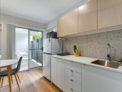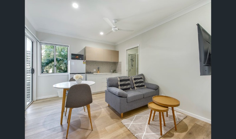 The apartment features a cozy living and sleeping area, a functional kitchenette, and a private bathroom