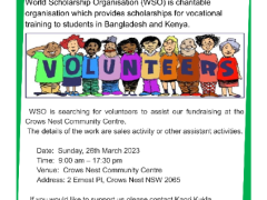 World Scholarship Organisation (WSO) は世界の恵まれない学生が職業訓練 校に行けるよう奨学金を提供している非営利団体で、現在はバングラデッシュとケニアの学生を支援してます。今回、2023 年3月26日 (日曜日) の午前9時半から午後5時半までCrows Nest Community CentreでのFundraisingのお手伝いをして下さるボランティアさんを募集しております。ご興味のあられる方はKaori Kukla (mpmqp9715@gmail.com にご連絡ください。