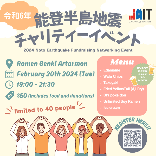 イベント詳細:https://jait.com.au/2024-noto-earthquake-fundraising-event-in-sydney/