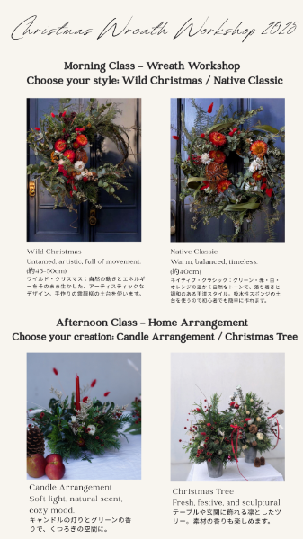 参加費 午前リース:$158 午後ツリー/アレンジ:$150
