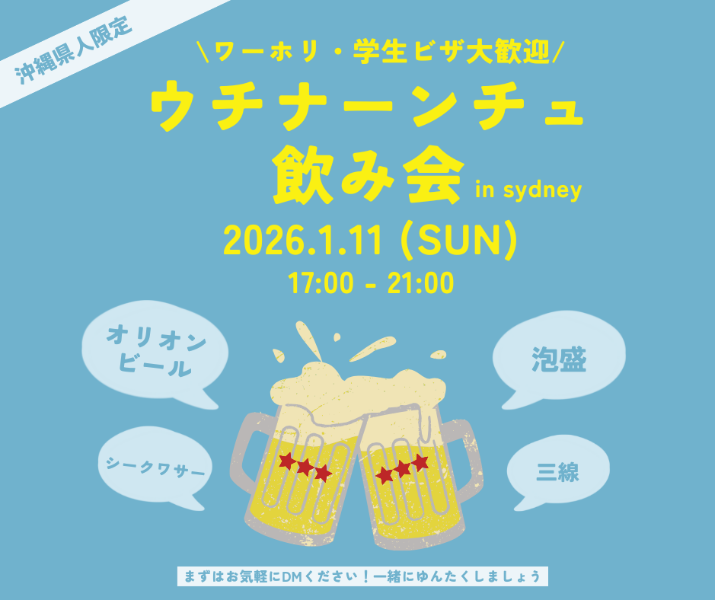 オーストラリアにワーホリ・学生ビザなどで滞在している 20〜30代の若手沖縄県出身者 を対象に、ウチナーンチュ飲み会(交流会)を開催します!