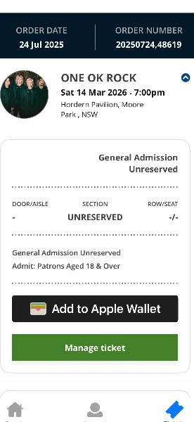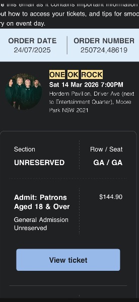 ONE OK ROCKの3/14シドニー公演のチケットが1枚余っており、同行していただける方を探しています! チケット代は$144になります。 もしご興味ある方いらっしゃいましたらお気軽にご連絡ください!
