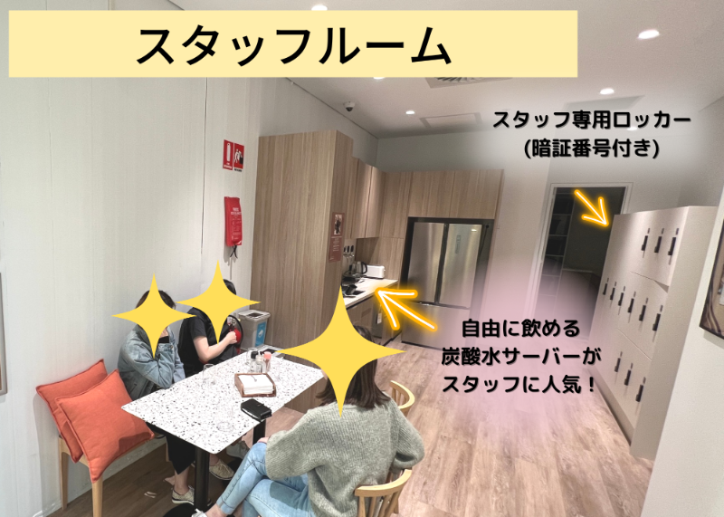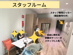 ・暗証番号式のロッカーあり。スタッフルームには電子レンジや冷蔵庫などあり。