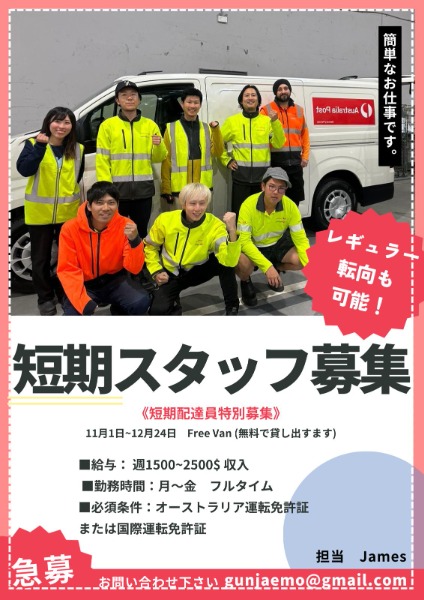週平均$1,500〜$2,500!Australia Post 配達員 特別募集!(短期&レギュラー)