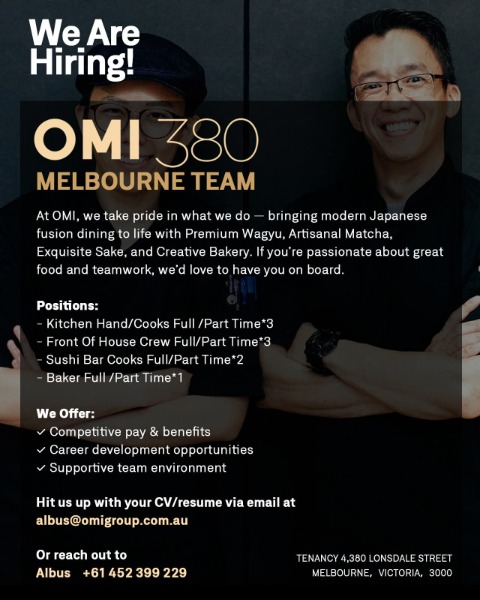 メルボルン市内にある、日本食フュージョンレストランOMI380で、スタッフを募集しています!