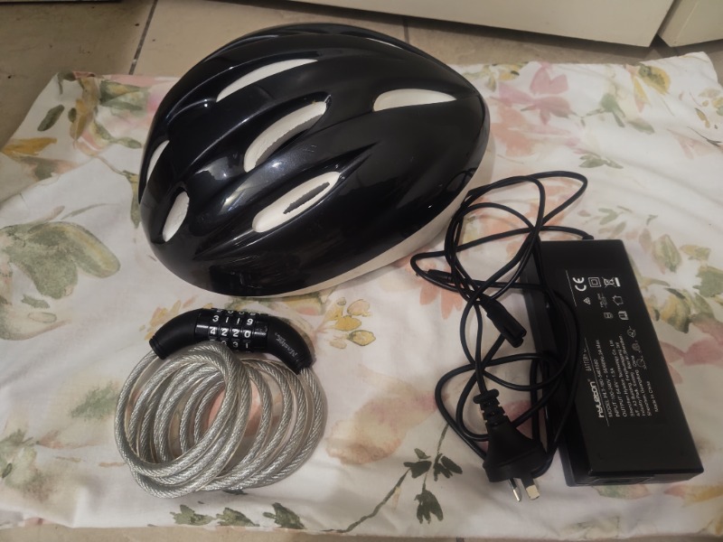 付属品はヘルメット、頑丈なロングタイプのロック、Uber用バック(最近新品に交換)、カーゴバイク用のキャリア、バッテリー充電器(状態良好)。🚲