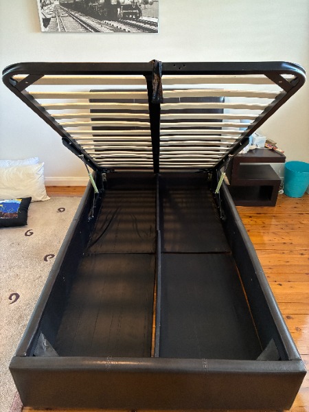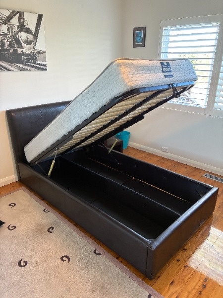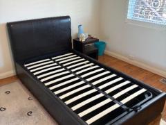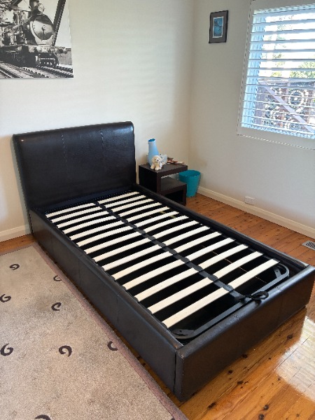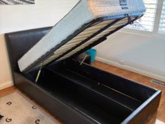 スタイリッシュなブラウンレザーのキングシングルベッドフレームです。ガスストラット付きで、マットレスを簡単に持ち上げる事が出来、ベッド下収納にアクセスできます。省スペースで、お部屋をすっきり保つのに最適です。