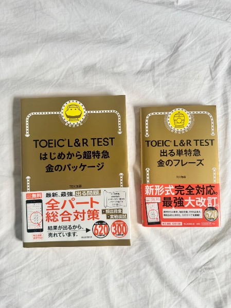 TOEIC単語帳 "金のフレーズ" とリスニング、ライティングの対策本 "金のパッケージ" のセットを$50で販売します!📚✨