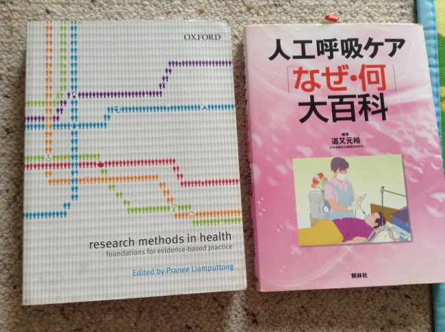 日本での看護学生時代のもの、救命救急で働いていた頃に使っていたもの、こちらの看護大で使用したものまで幅広くあります。