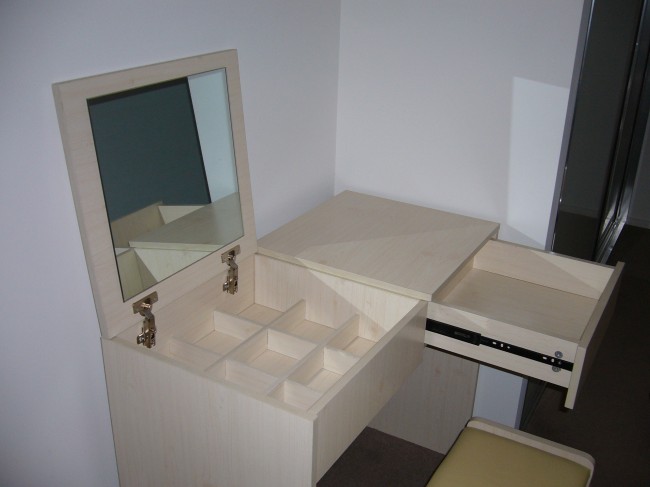 仕切りと鏡、引き出しがついていて、収納抜群です。