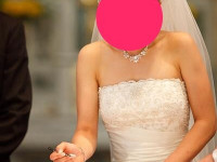 これから結婚式される方、ウェディングドレスいかがでしょうか。セミオーダーで2000ドルで購入。身長163cm、5cmヒールを履きました。後ろが紐のタイプで、通常の服のサイズがAU8くらいの方でしたらぴったりだと思います。