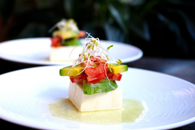 豆腐とアボカドのあったかサラダ、わさびドレッシング:蒸し野菜ならぬ、蒸し豆腐とアボカドのサラダ。さわやかなわさびドレッシングでオーガニック豆腐を満喫。おもてなしディナーのアントレーにぴったり