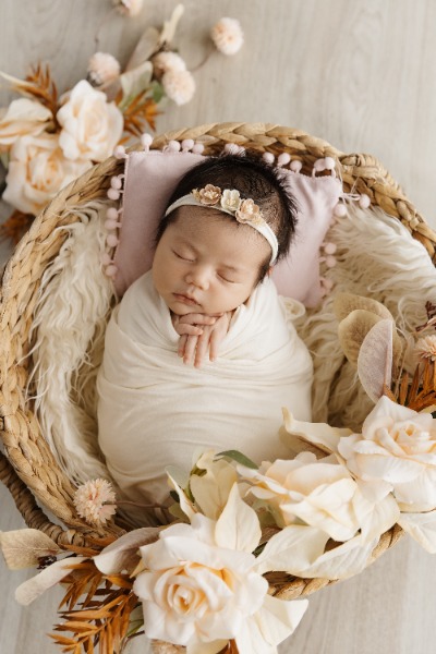 ニューボーン用のお包み、かご、ヘアアクセサリー、布等必要なプロップスはお持ち致します。