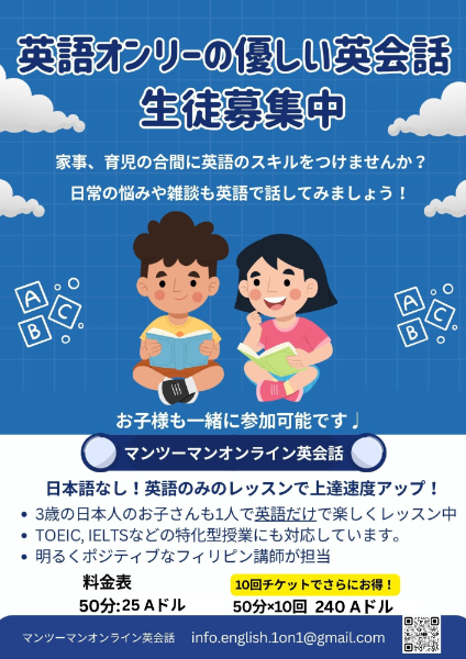 マンツーマンオンライン英会話の生徒募集! 50分24A$〜