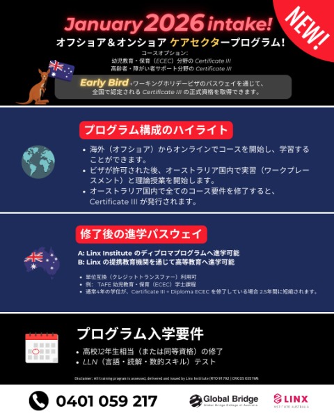 ✨ 今後数か月でオーストラリアに行く予定がある方、またはワーキングホリデービザ 462/417、ビジタービザ 600、または学習可能なビザをお持ちの方は — 日本やどこからでも高齢者ケア・児童ケアのコースに登録できます! 🇦🇺✨
