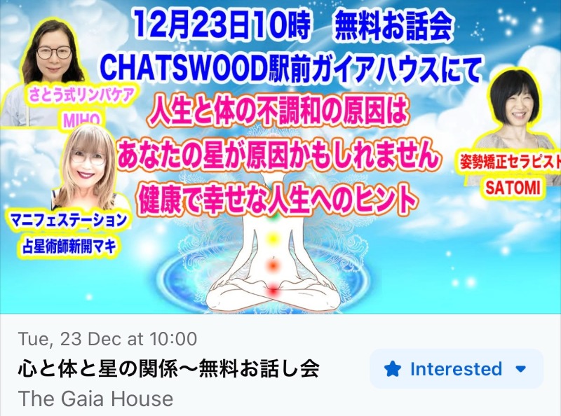 心と体とあなたの星の関係についてのお話会 なんと、無料です! 日時 12月23日 10時 場所 The Gaia House 220/1 Katherine St, Chatswood ...