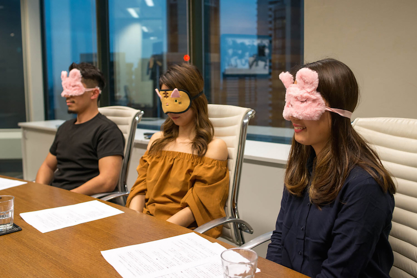 まず始めにみなさんに帰国後の進路希望に関する8問のアンケートを取りたいと思います。人の意見に左右されちゃうといけないので、みなさんアイマスクをつけてもらっていいですか?