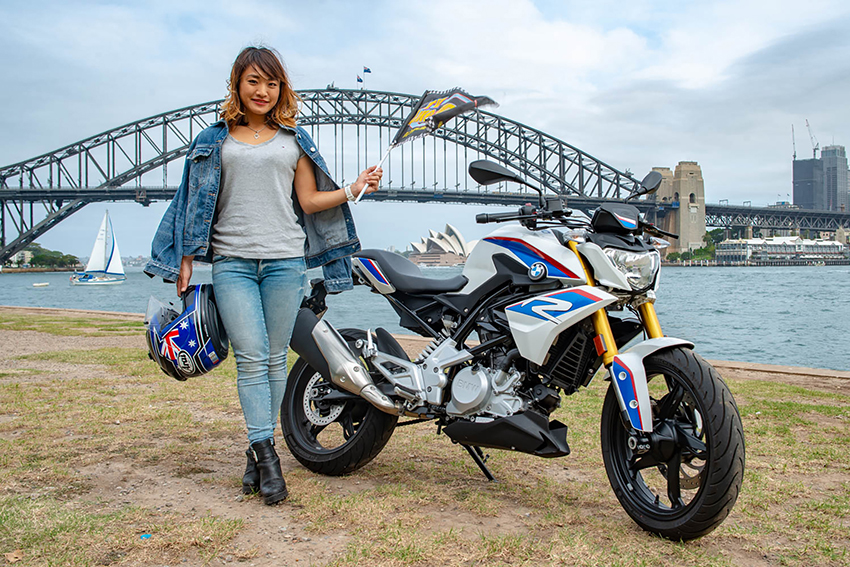 インタビューの待ち合わせ場所であるマクマホンズ・ポイントに到着した時、すでにそこには鮮やかなトリコロールカラーの相棒「BMW G310R」と共にシドニーハーバーを眺める彼女の姿があった。