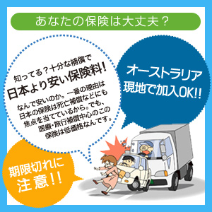 それぞれに適した保険を選択されるといいと思いますが、ジャパセンは、日本からでもオーストラリア入国後でも対応ができる保険会社の代理店なのでお問合せやお申込みはお気軽にお知らせ下さい。また、以下の通りにジャパセンで取り扱っている保険に関してお知らせをしたいと思います。