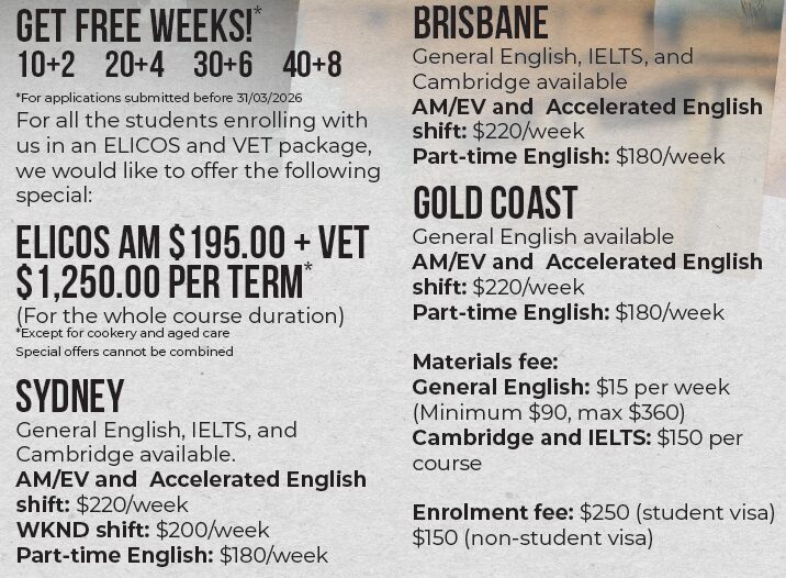 通常、月曜日~木曜日 or 月曜日~金曜日の週4日/5日が一般的なのですが、シドニーでも数少ない、週3日の開講(学生ビザ対象コース)をしています。