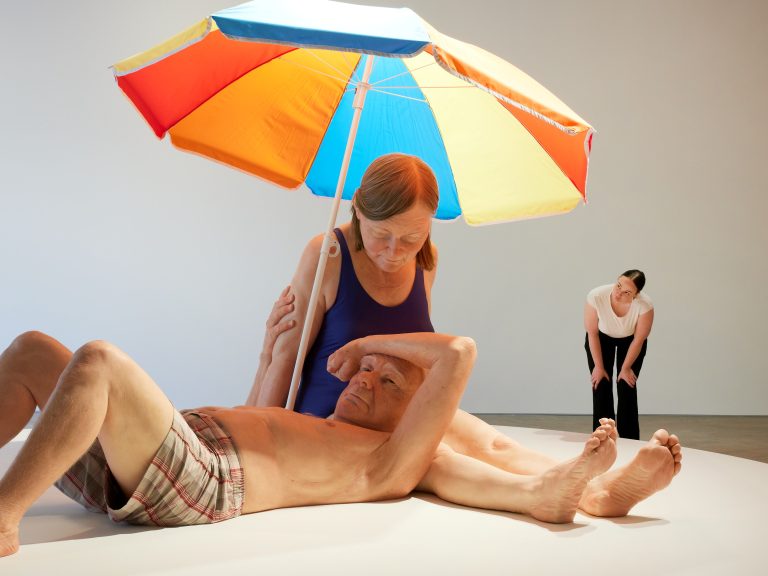 Picture: Installation view of the ‘Ron Mueck: Encounter’ exhibition, featuring ‘Couple Under an Umbrella’ 2013/2015, Giverny Capital Collection © Ron Mueck, photo © Art Gallery of New South Wales, Felicity Jenkins