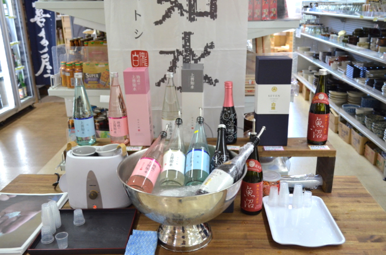 奥の棚左から「上善如水 純米」「熟成の上善如水 純米吟醸」「上善如水 純米吟醸」「上善如水 スパークリング」「濃醇 魚沼」「白瀧 SEVEN 純米大吟醸」
