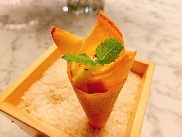 口直しのソルベにも見えるのは、まるでアイスクリームのような自家製コーンに入った「和牛ビーフのタルタルコーン」。ビーフのタルタルとトリュフのヴィネグレットソイソースを掛け合わせた一品。
