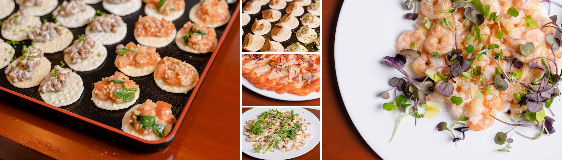 【試食の前菜】写真左上から、「Imamura Sauce and Dressing」を使ったサーモンカルパッチョ、マッシュルームサラダ、プロウンカクテル、「Dai’s Natto」を使った納豆&ゴルゴンゾーラカナッペ 、小粒納豆&ブルサンカナッペ、引き割り納豆&トマトカナッペ/©︎Tomo Okai