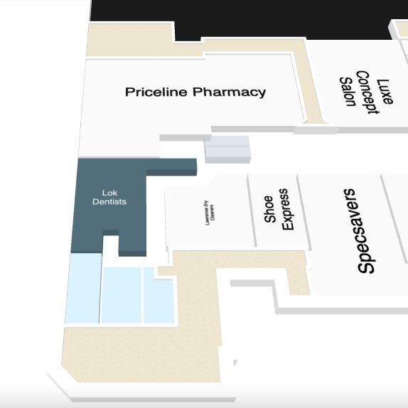 「Lok Dentists」は、チャッツウッド駅前にある大型ショッピングセンター、Chatswood Chaseの建物内に入っています。地上階にあるエスカレーターから地下1階へ降りた背後の、Pricelineの隣にあります。
