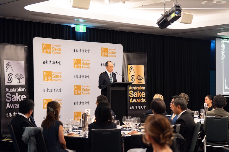 祝賀会の冒頭では、在シドニー日本国総領事館の山中修総領事より開会の挨拶があり、日本酒を通じた日豪間の文化交流の意義や、現地での日本酒人気の高まりについて語られた。