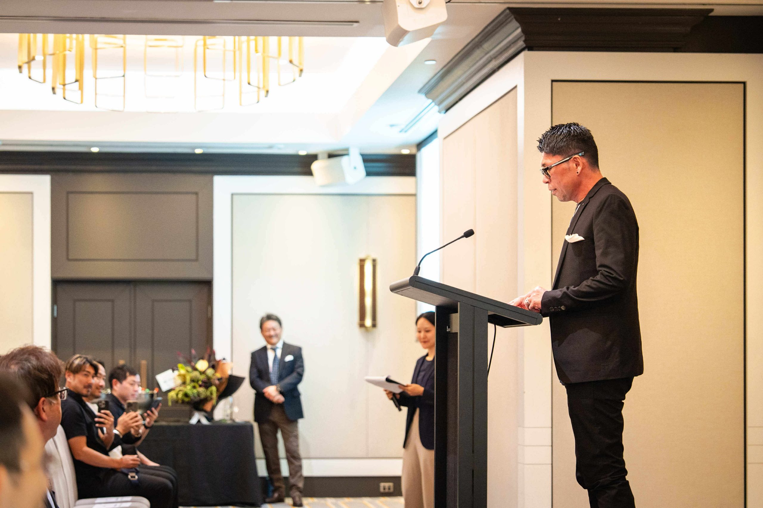 「本日は、私どもの20周年記念式典にご参列賜り、誠にありがとうございます。この節目の日を、弊社スタッフ一同、ビジネスパートナーの皆さま、ご来賓の皆さまと共に迎えることができ、とても光栄です。