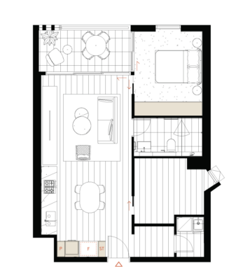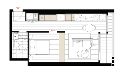 お値段は$498,000から(2025年10月29日現在)と、$500,000 以下のとてもお得な値段設定となっております。このフロアプランではベッドルームエリアとリビングエリアがキャビネットで仕切られており、プライバシーも確保できるスマートなフロアプランとなっております。