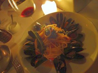 ムール貝のパスタとスナッパーのグリル。