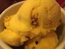 マンゴーアイスとココナッツアイスが2段になったデザート。マンゴーのさわやかな香りと、ココナッツミルクで少々こってりしたお味。(写真下:右)