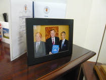 あっという間に一年半が過ぎ、忙しかったなぁというのが正直な感想です。私が来てから新しく始めたことに、総領事館HPに活動報告などの写真やいろいろな情報を載せるなど、開かれた総領事館づくりを進めるということがあります。外務省や総領事館が普段どのようなことをしているのかわからない方も多いと思いますので、総領事館の活動を知ってもらうというのが先ず重要だと捉えているからです。あとは、私の重要な任務の一つで、オーストラリアの政治家や経済人、文化人など幅広い人との交流を深めるべく、週に二回ほど公邸でビジネスランチ・ビジネスディナーを行っています。これらは(写真下)タスマニアや南オーストラリアなど各州の首相や大臣、総督などの写真、こちらにあるのは、今までに会食に招待した方々からの御礼状の数々です。またスピーチや挨拶などの機会も多く、この一年半で約60回を数えました。原稿は殆ど自分で作成するので大変です。