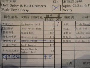 オーダーシートでもおわかりの通り、スープは「HALF SPICY & HALF CHICKEN PORK BONE SOUP」を選びました。