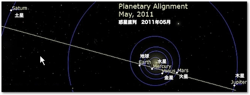 太陽系の惑星が、ほぼ一直線に並んでいるため、このように見えるということです