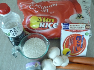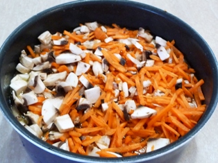 4、人参、マッシュルームを加え、米を水・調味料に浸してから20分以上経過していたら