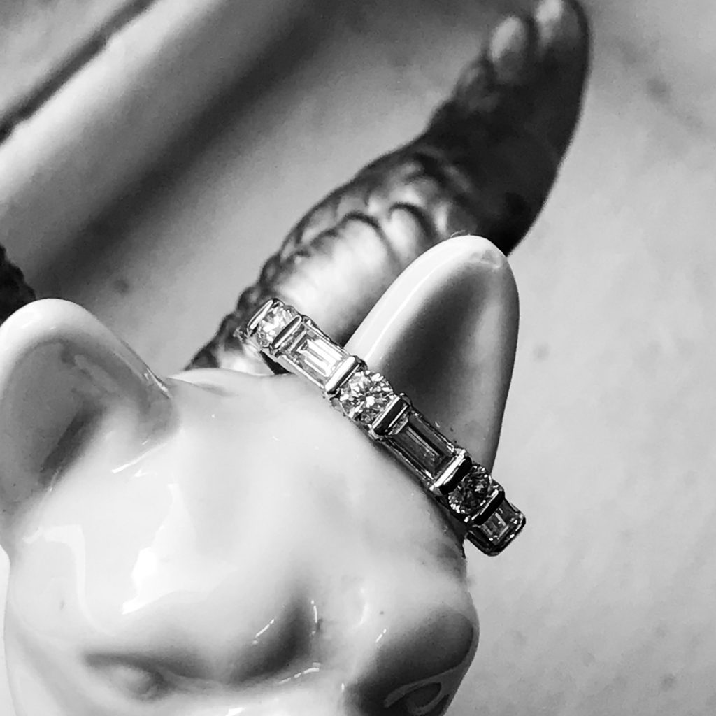 女性はバケットとラウンドのダイヤを交互に並べた個性的なデザイン